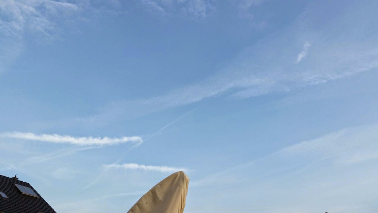 Blick nach Ost-Süd, mit Neuaufbau der Chemtraildecke entlang der Sonnenstrahlung und der Thermik, die ihr folgt. Die Chemtraildecke ist der Hebel, die Hauptarbeit macht die Sonne. |