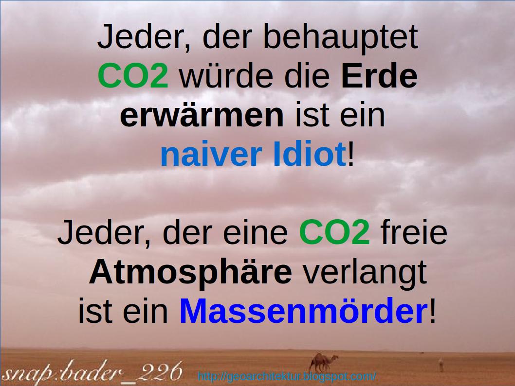 Der Anteil des vom Menschen ausgeatmeten, ausgestoßenen, ausgeblasenen CO2 ist absolut nur 0,0011%, der Anteil der Industrie nur 0,0000077%, also in der Gesamtmenge unerheblich!